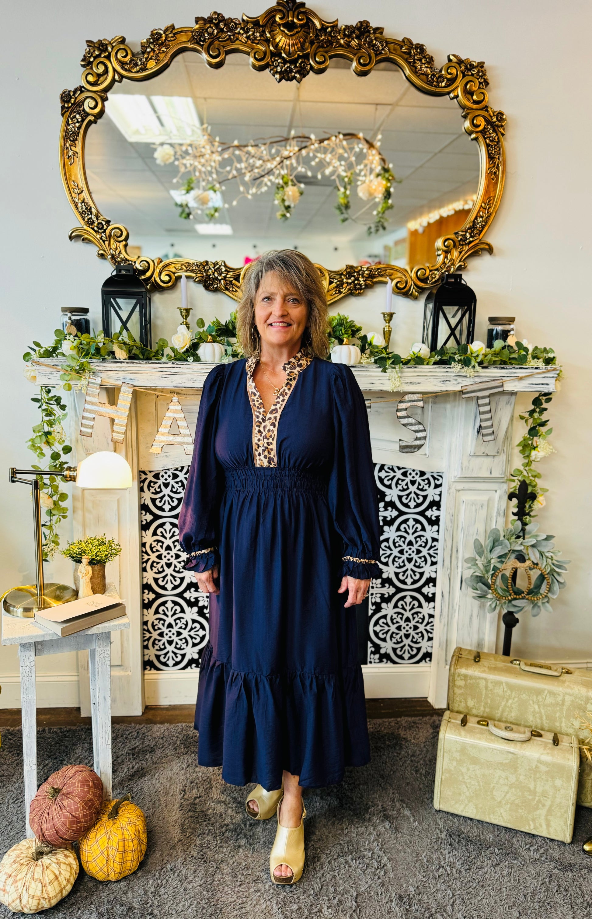 This elegant midi dress features a subtle leopard trim that adds a touch of wild sophistication to its refined silhouette. The smocked waist ensures a comfortable yet flattering fit, accentuating your natural shape with ease. Perfect for both day and evening occasions, this dress combines timeless style with modern detail to elevate your wardrobe effortlessly.
