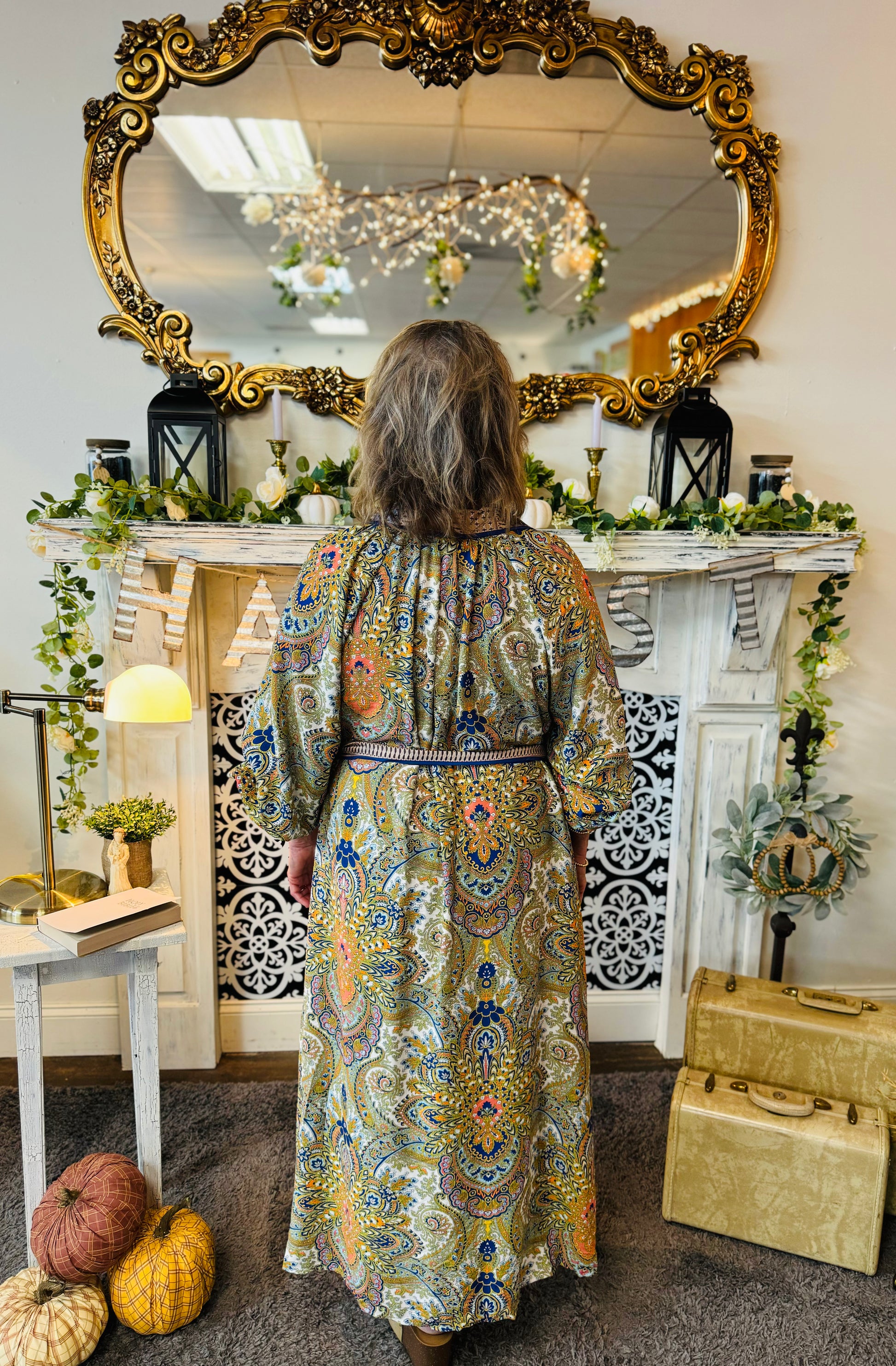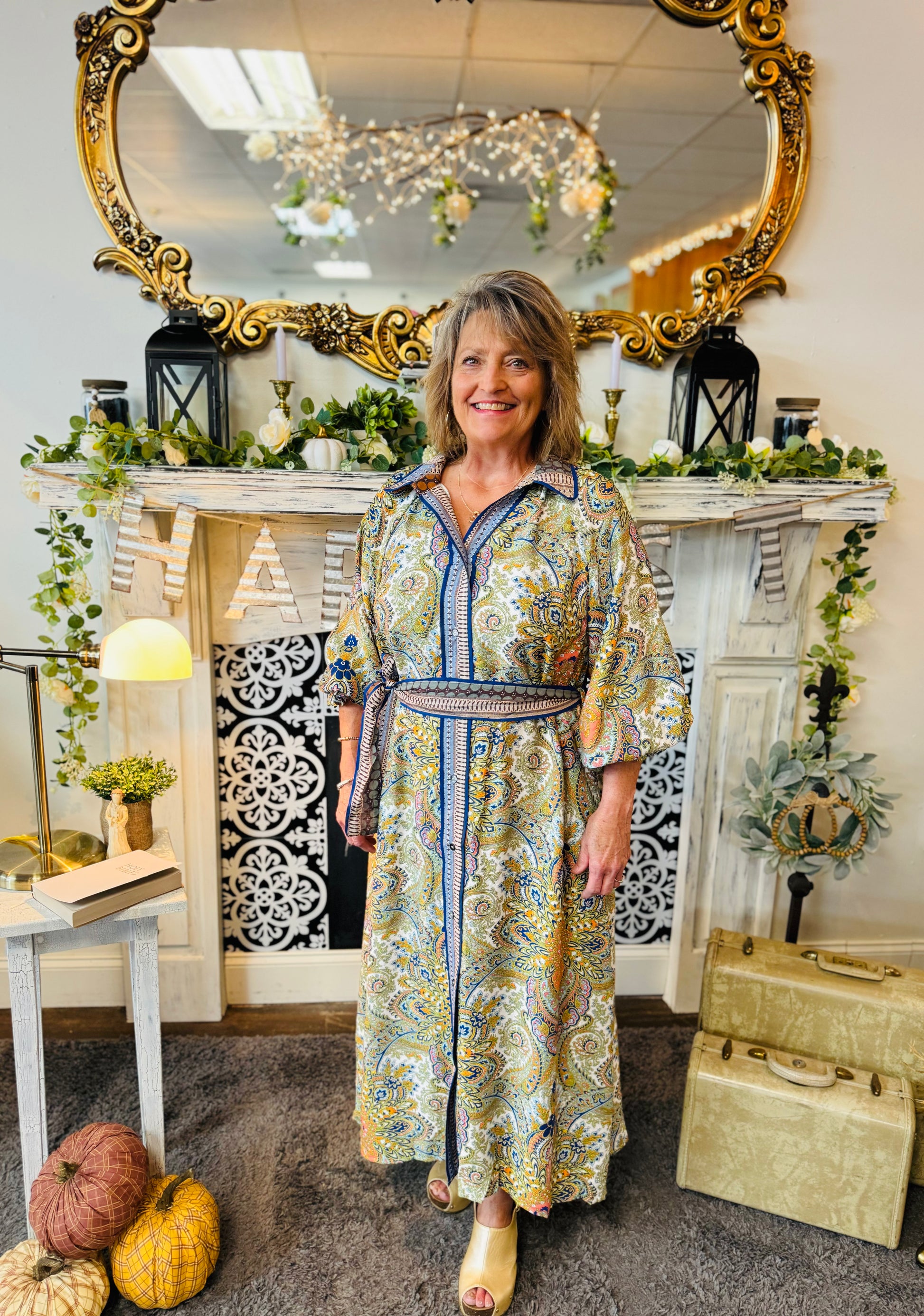 This paisley mixed print belted midi shirt dress offers a refined blend of classic tailoring and elegant patterning. Featuring a defined waist with a coordinating belt and a midi-length silhouette, it provides a flattering, polished look suitable for both professional and social settings. The detailed paisley design adds subtle sophistication, making this dress a versatile choice for a cultivated wardrobe.