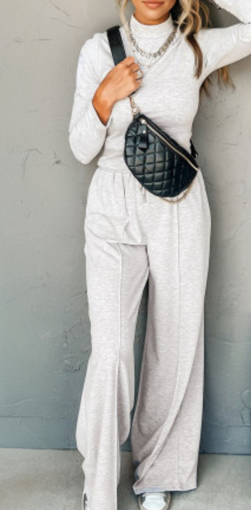 This curated two-piece collection combines understated elegance with thoughtful design details. The long sleeve top showcases a refined high neckline and fitted silhouette, while strategic smocking at the waist creates gentle shaping without compromising comfort. The accompanying pants feature a distinctive central seam that provides a streamlined, lengthening effect. Rendered in versatile light grey, this set transitions effortlessly from office to evening, offering the timeless sophistication that discerning style demands.