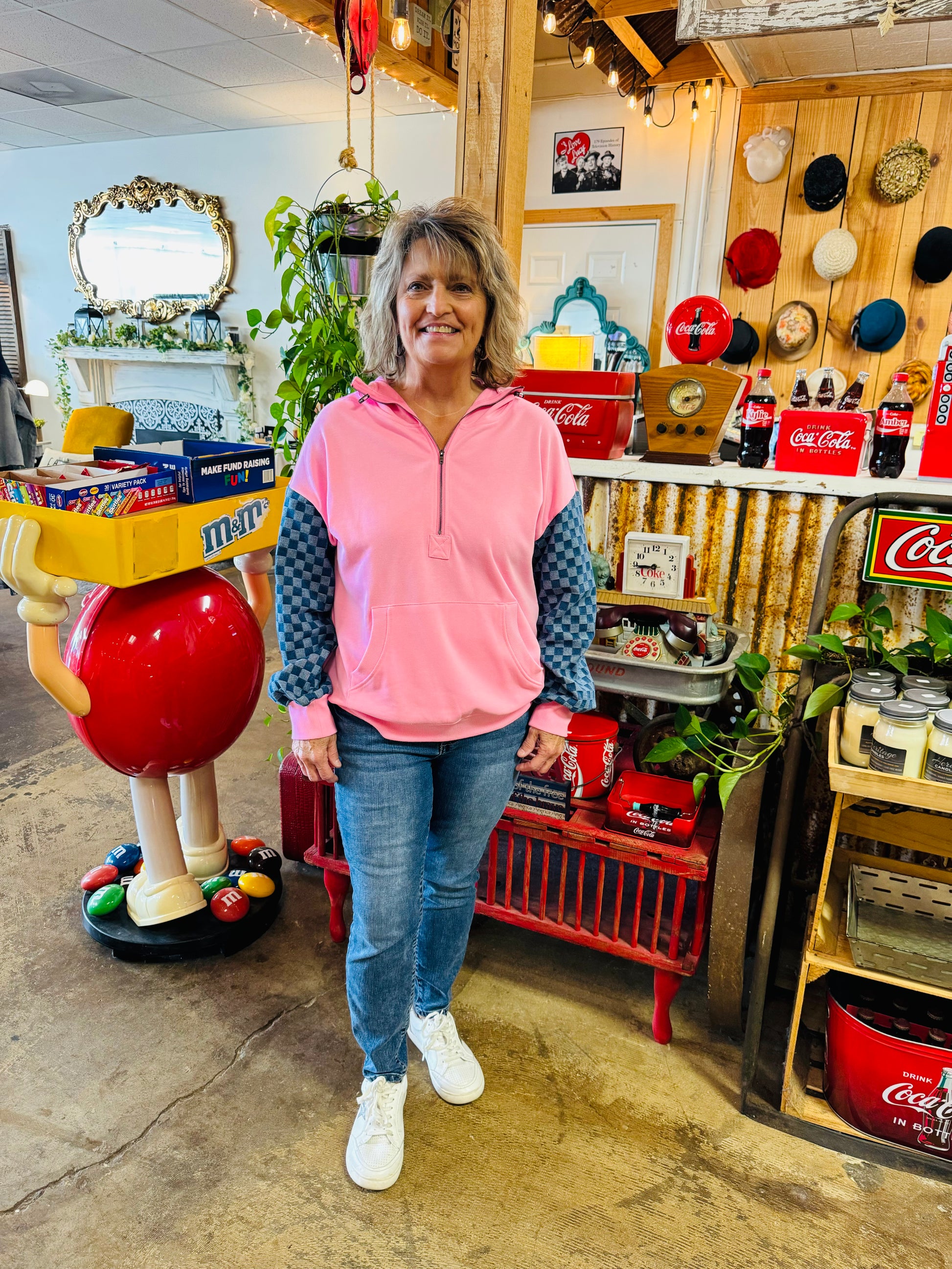 Discover refined comfort with the Bonbon Checkered Patchwork Hoodie. This distinguished half-zip design features an artful checkered patchwork and a kangaroo pocket, perfectly blending style and functionality. Ideal for a polished yet relaxed look, it offers a subtle statement piece for your wardrobe’s transitional seasons.