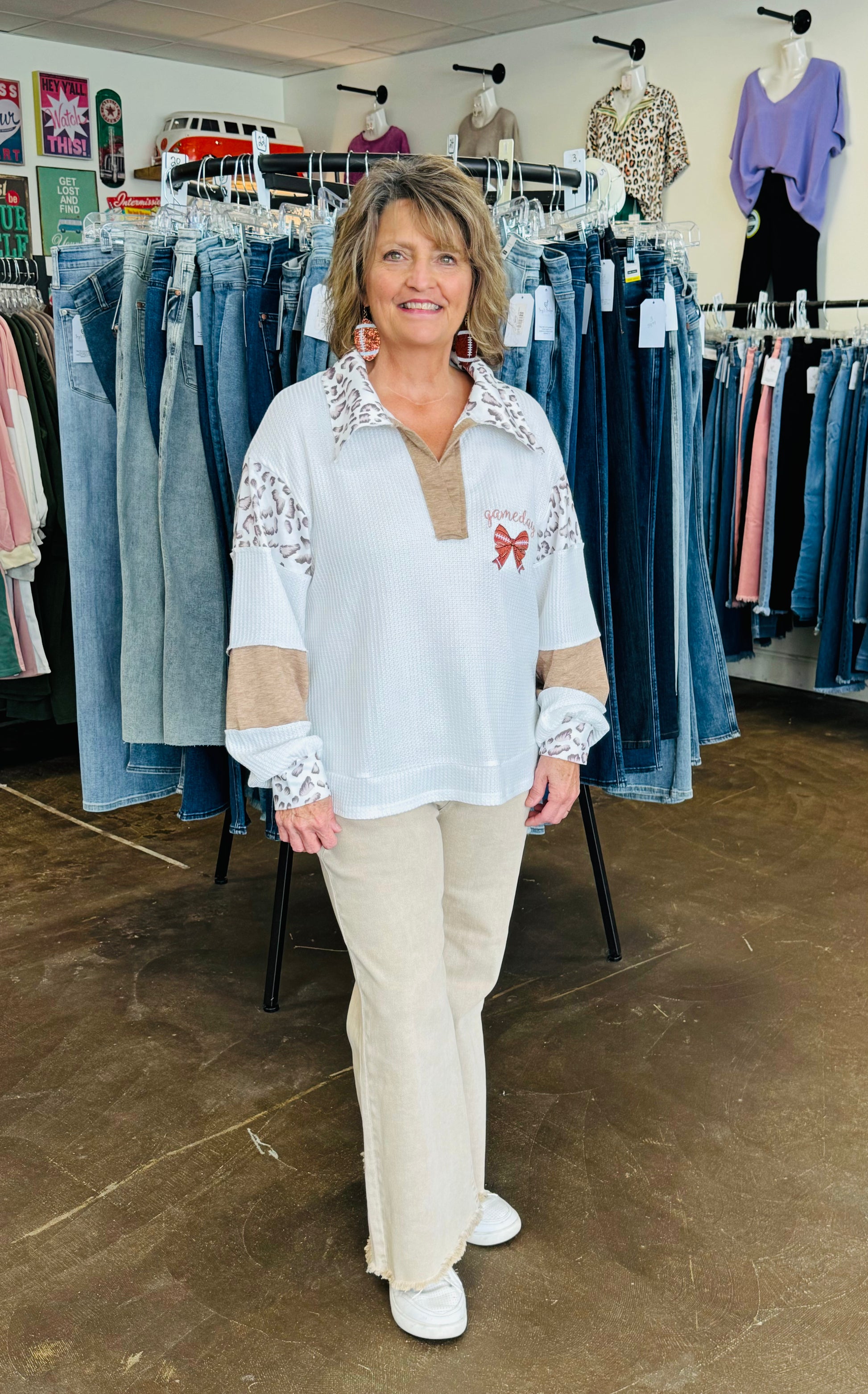 Get ready for game day in style with our FOOTBALL GAMEDAY PULLOVER! This trendy top features a white football bow and embroidered graphic, with a touch of fierce with the leopard collar. The color block patchwork design will surely make a statement, all while showing off your team spirit. Don't miss out on this must-have for any football fan.