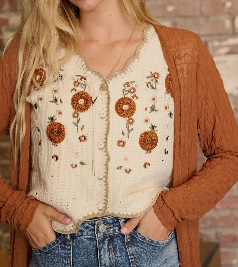 This sleeveless vest features intricate floral embroidery combined with delicate crochet craftsmanship, offering a refined and elegant look. Perfect for layering, its lightweight design adds texture and sophistication to any outfit, making it ideal for warm-weather occasions or stylish layering year-round.