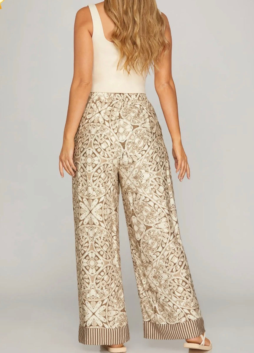 The Lucy Gray Pants combine timeless elegance with modern comfort. Crafted from a refined woven fabric, these wide-leg trousers feature a striking contrast hem that adds visual interest and contemporary flair. The elastic waistband ensures a comfortable, secure fit throughout the day, while the printed design brings subtle sophistication to your wardrobe. Perfect for elevated casual occasions or polished everyday wear, these pants transition seamlessly from day to evening.