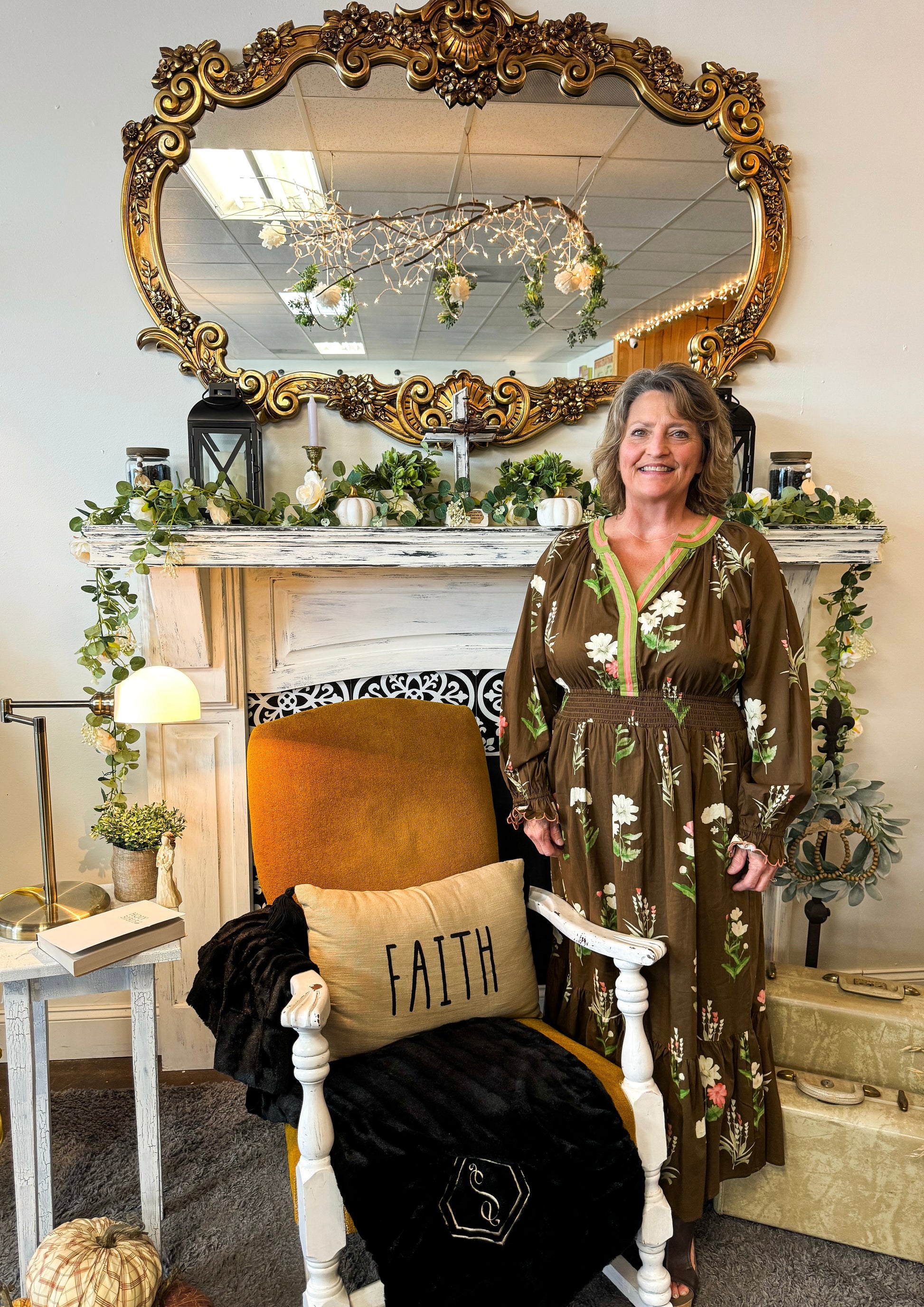 This brown mix floral print midi dress features a refined V-neckline and elegant ruffled sleeves, combining timeless style with subtle feminine details. Its graceful silhouette and flowing design make it an ideal choice for sophisticated events or polished everyday looks.