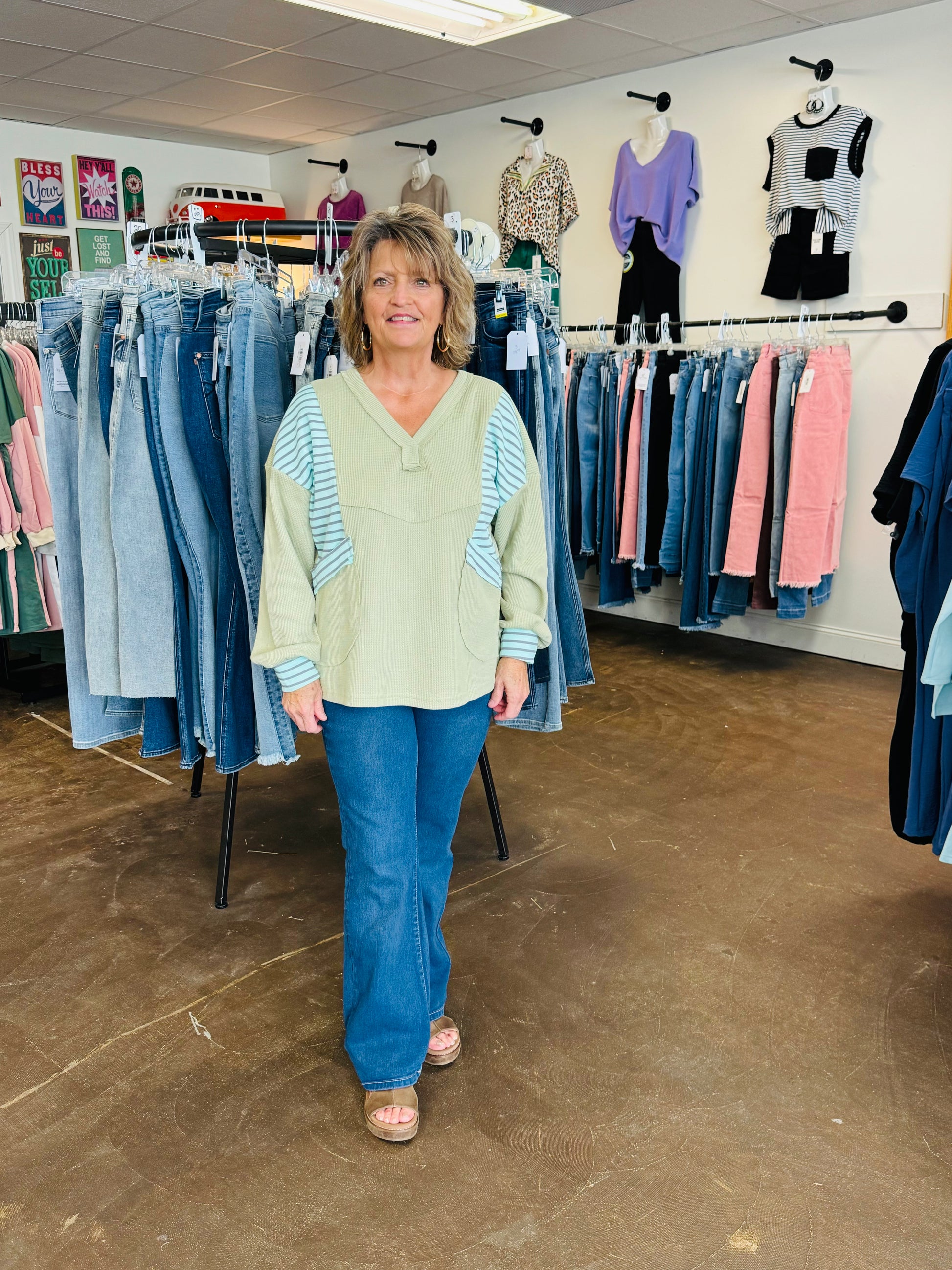 Experience comfort and style with our Meadow Mist Green Exposed Seam Waffle Striped Patchwork Baggy Pullover. The exposed seams add a touch of uniqueness to this pullover, while the waffle striped patchwork adds texture. Perfect for staying cozy and fashionable, this pullover is a must-have for your wardrobe.