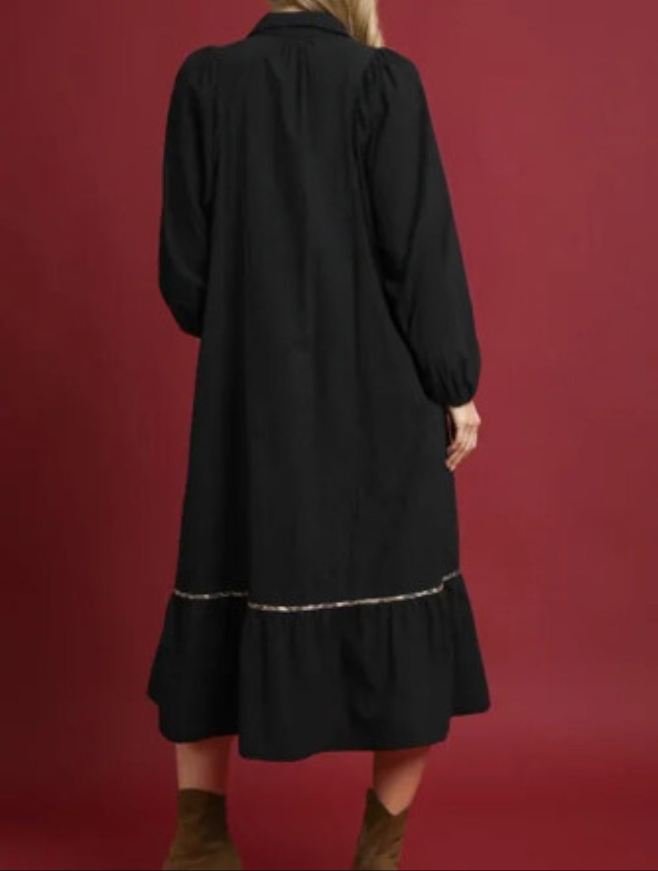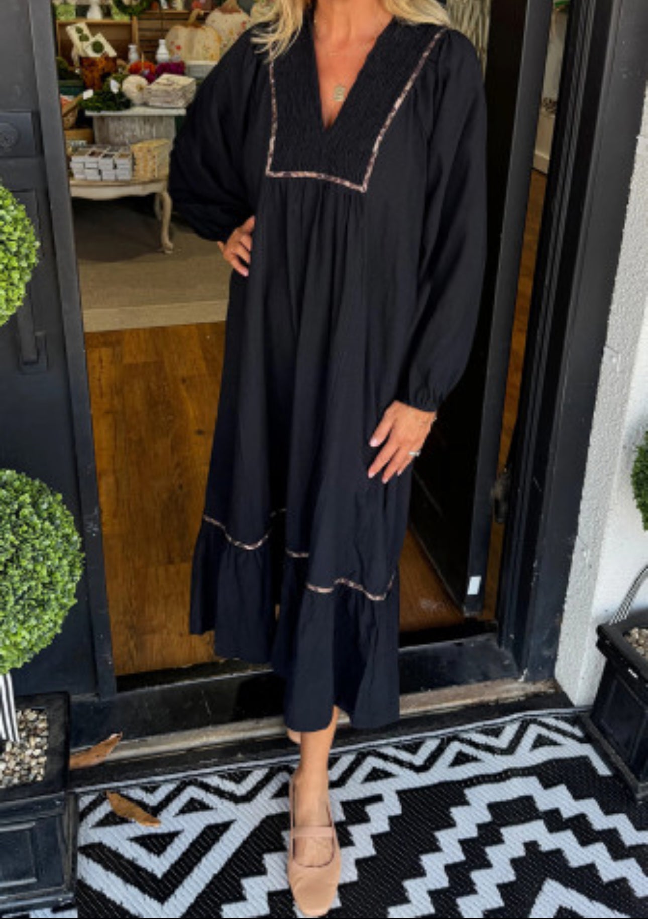 Indulge in luxury with our Black Collared V Neck Smocked Detail Contrast Leopard Trim Bracelet Sleeve Long Dress. This stunning piece boasts a sleek silhouette with a touch of boldness in the leopard trim. The smocked detail adds a sophisticated touch to the v-neck collar, while the bracelet sleeves provide comfort and elegance. Elevate your wardrobe with this exclusive dress.